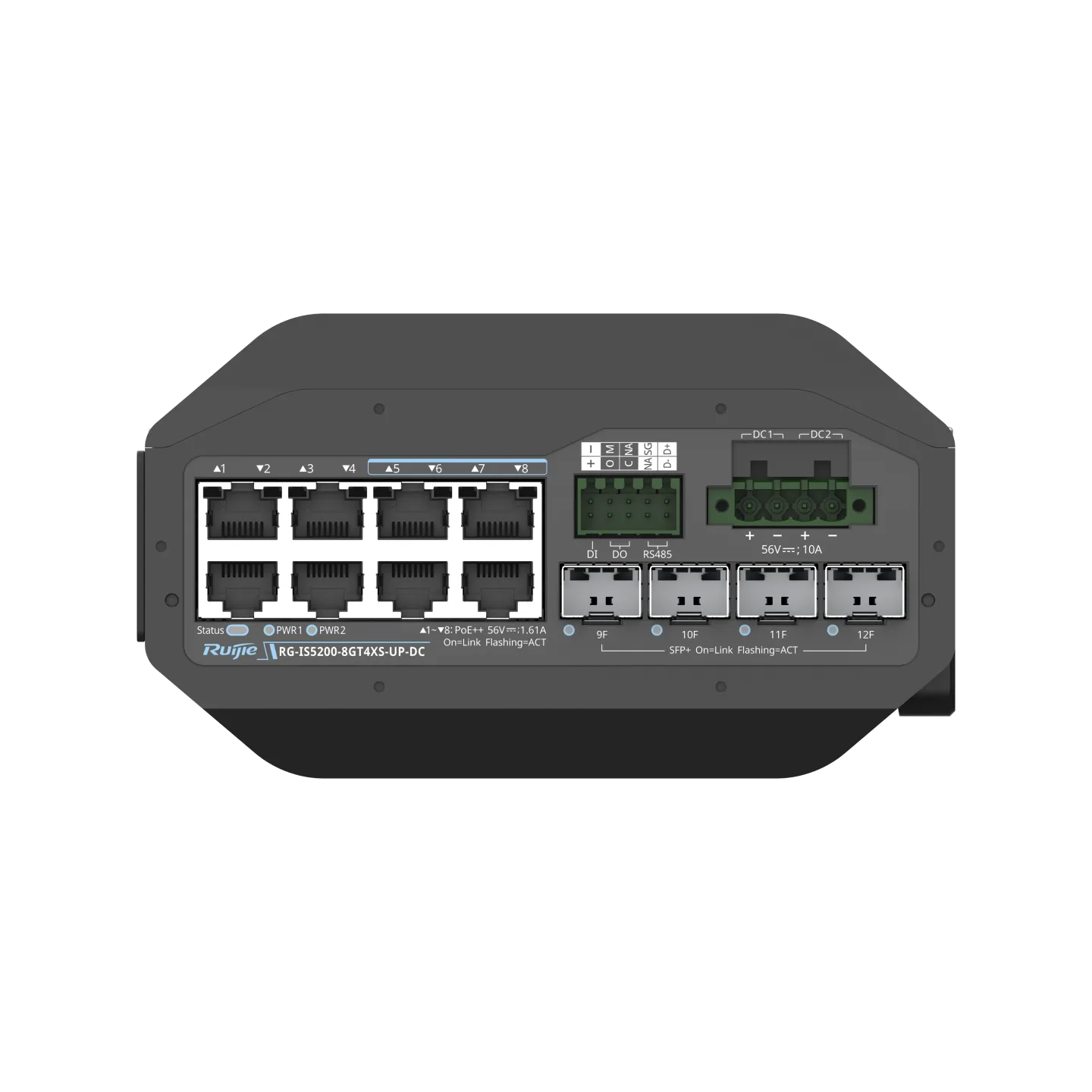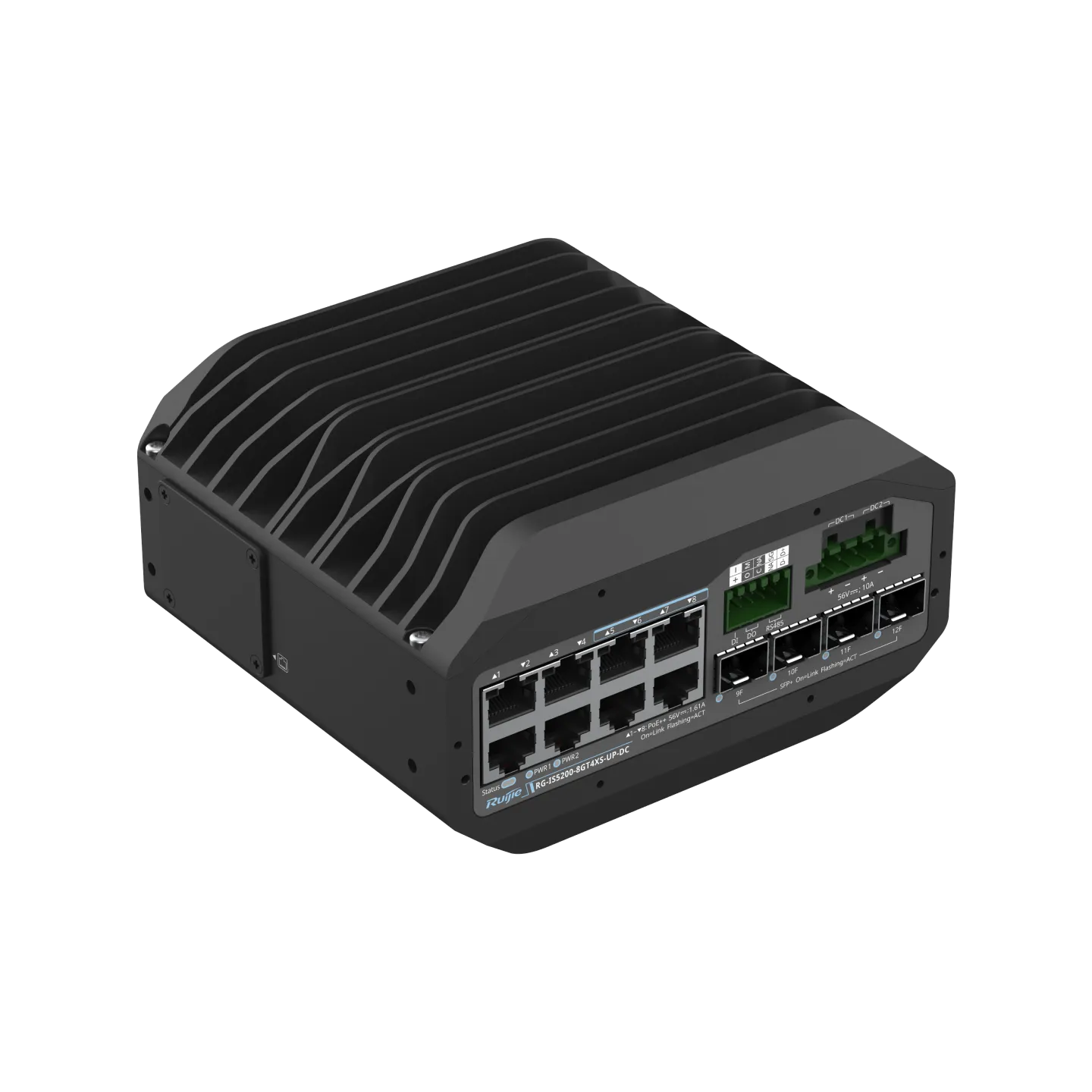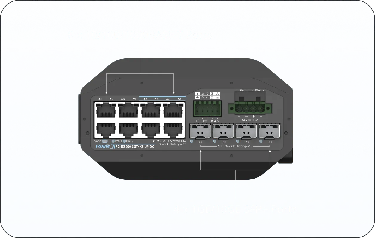 RG-IS5200-8GT4XS-UP-DC adalah solusi tangguh untuk infrastruktur industri yang membutuhkan daya besar. Switch ini mendukung Ultra-PoE (90W), ideal untuk menghidupkan kamera PTZ outdoor canggih atau layar display industri melalui input daya DC yang redundan.
