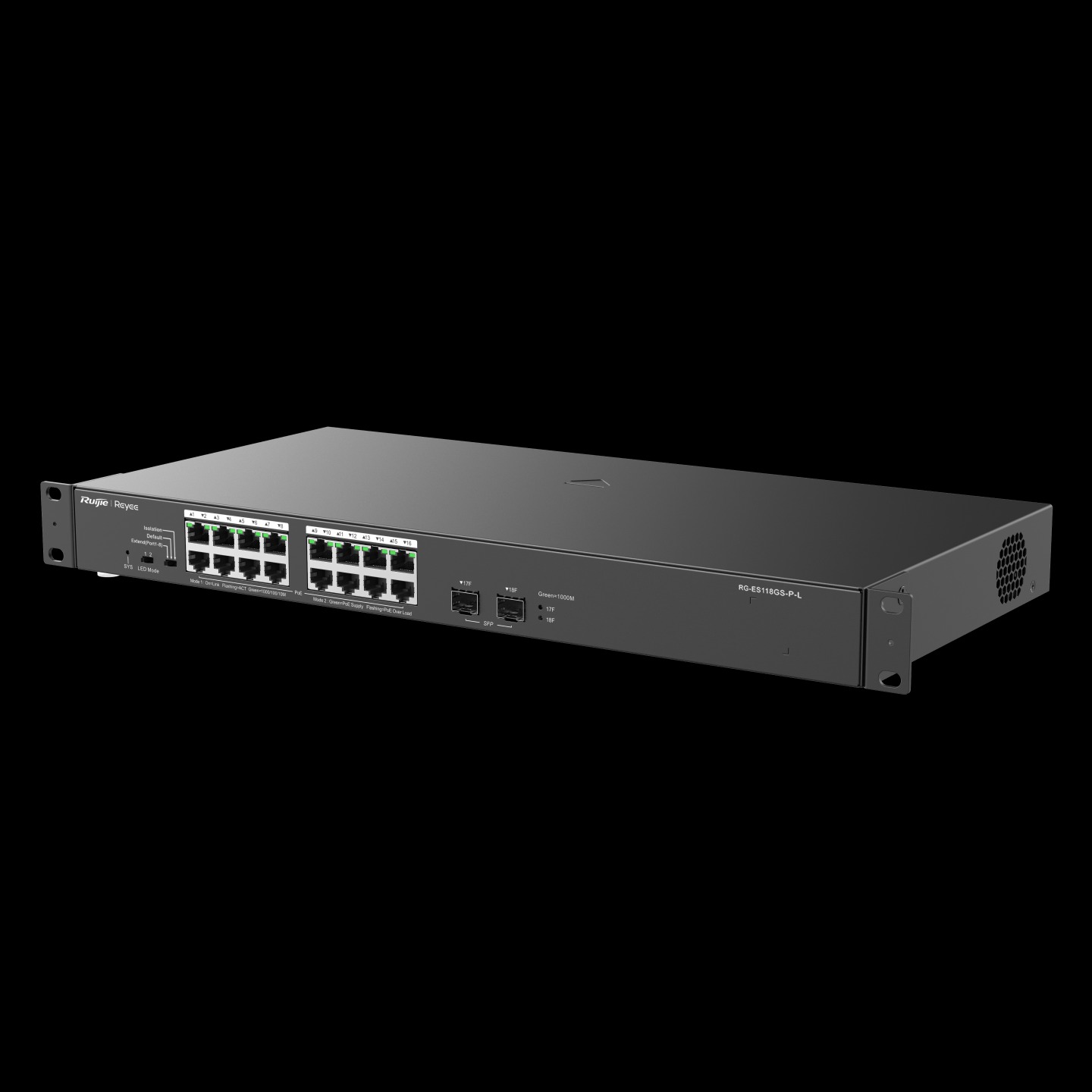 16-Port 1000Mbps + 2 Gigabit SFP Ports, 16 of the ports support PoE/PoE+ power supply. Max PoE power budget is 247W, Steel Case