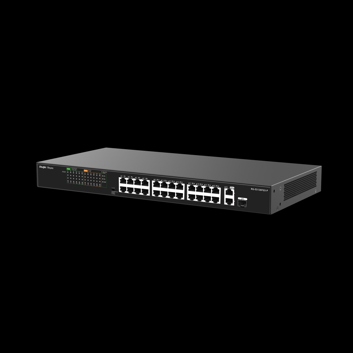 24-Port 100Mbps + 1 Uplink Port 1000Mbps + 1 Gigabit RJ45/SFP combo Ports, 24 of the ports support PoE/PoE+ power supply. Max PoE power budget is 370W, Steel Case